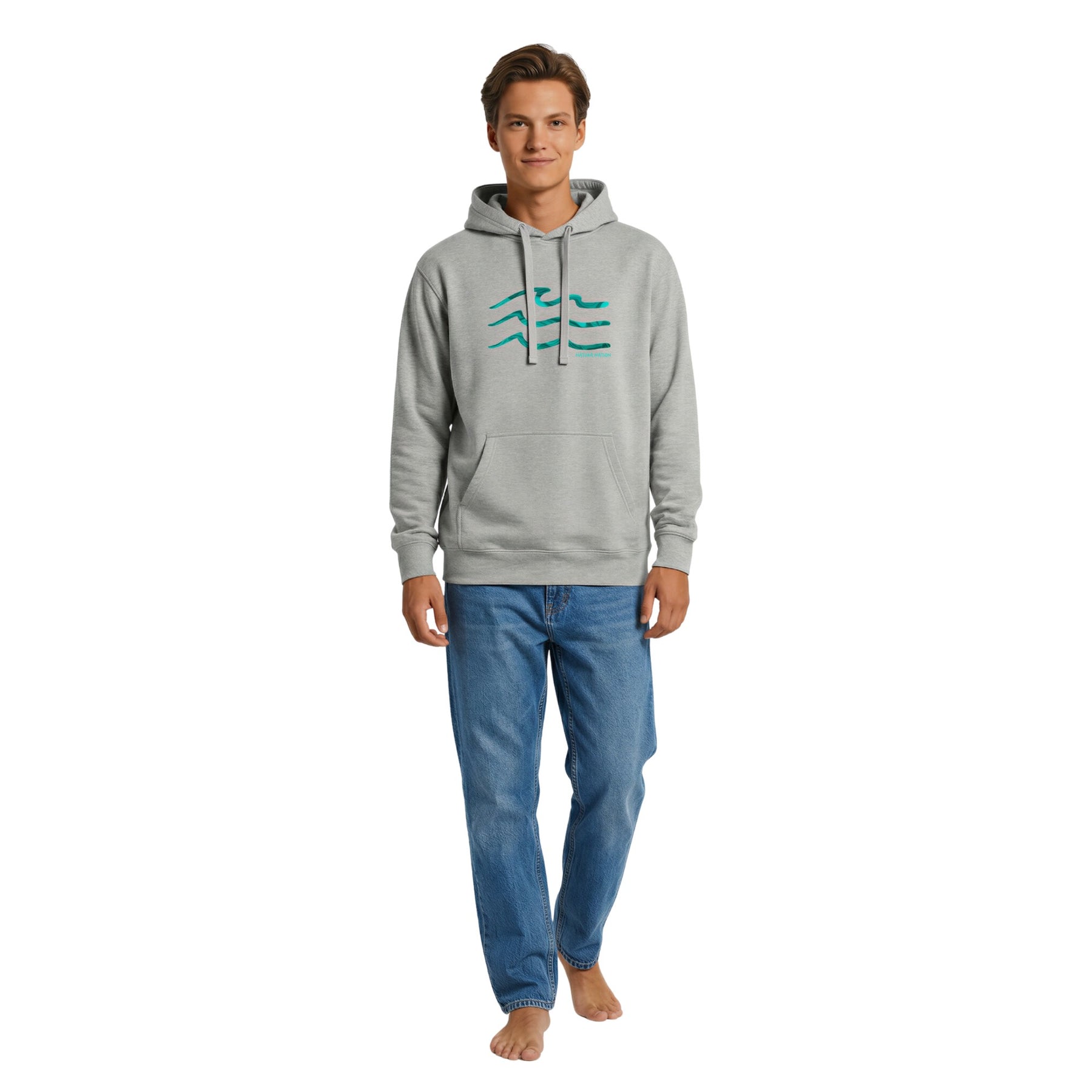 Man wearing a carbon grey ocean hoodie with the Serenity Waves design. A deep Ocean Clothing piece for tranquil seas made by Natura Nation.