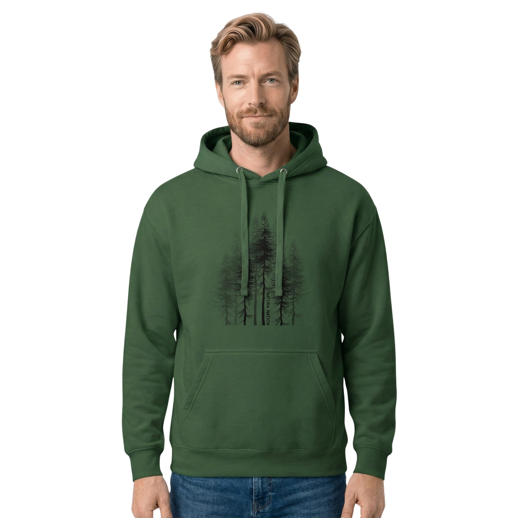 This special edition forest green pullover hoodie features our iconic pine tree design, crafted for deep forest exploration. Inspired by the dense, vibrant canopy of ancient forests, its deep, earthy tone captures the spirit of untamed wilderness and connection to nature's profound tranquility.